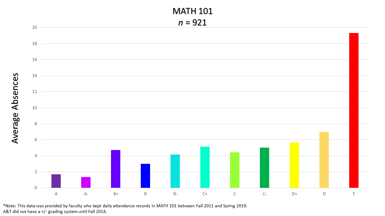 Focus group data conducted on the math faculty at A&T point to attendance as a primary cause of students not passing these courses. Students who regularly attend courses tend to pass. Data provided by general education math faculty who have kept meticulous attendance records from 2011-2019 corroborate this sentiment; a sample of this data is provided visually below for MATH 101.