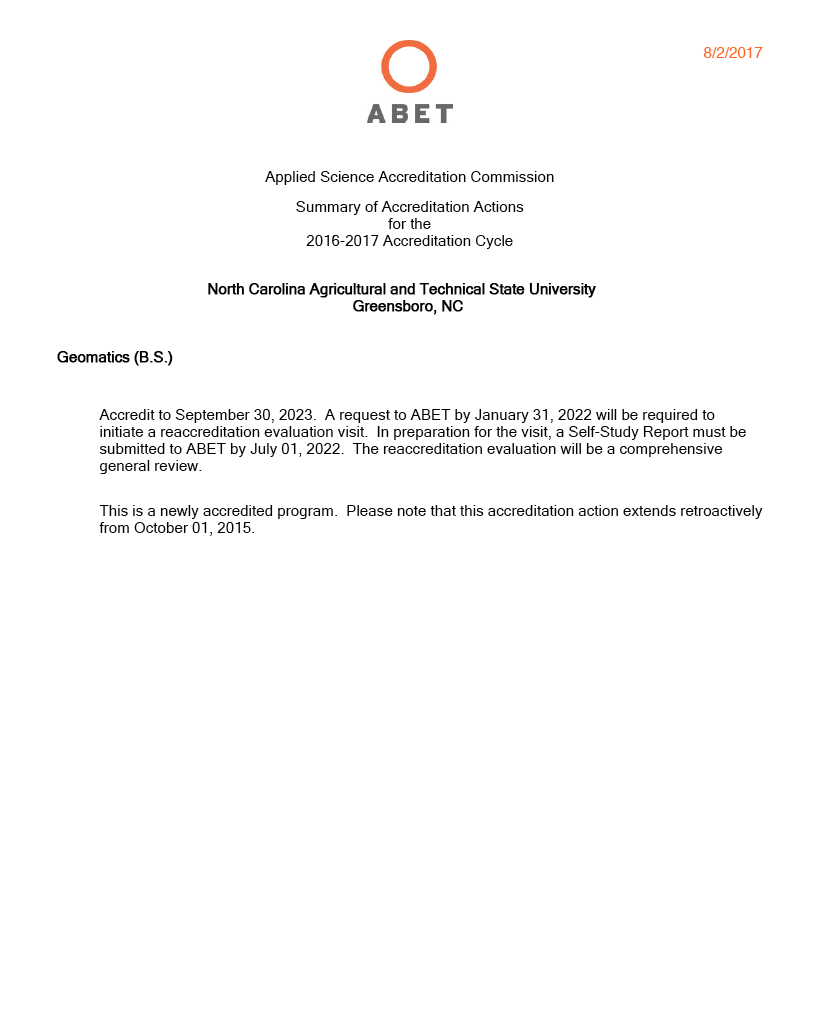 Association of Technology, Management, and Applied Engineering (11.15.2018, Next Visit: 2022), American Council of Construction Education (3.2.2015, Next Visit: Fall 2019)Geomatics (BS)